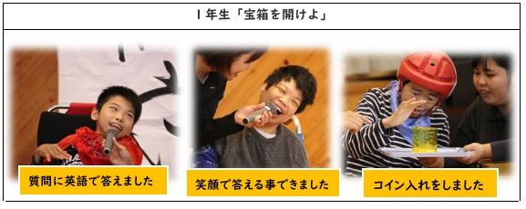 1年生は、「宝箱を開けよ」と題して、怪盗キッドから3人の大事な物を取り返すために普段の学習で身につけた力を生かして課題をクリアし、鍵をゲットしていきました。練習中は友達のチャレンジを応援したり、一緒に声や動作を合わせたりと、いつも以上に友達のことを意識し、クラスの絆も深まりました。 2年生は、「ぴったんこカン・カン・カン・カン」と題して、観客に向けクイズを出題しました。出題するクイズを自分たちで選び、出題し、答え合わせをし、観客に参加賞を配るという4人の見事な連携プレーに会場では大きな拍手が沸きました。