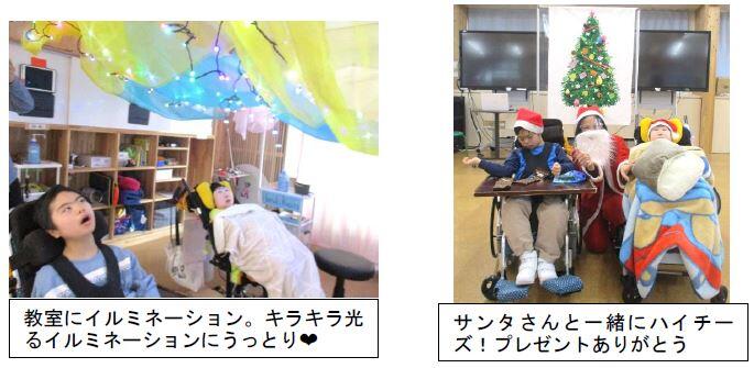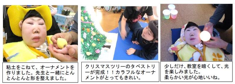 12月12日(月)から22日(木)までの9日間、生活単元学習「冬を楽しもう」に取り組みました。初日から22日までの活動は、クリスマスソングを聞きながら楽器を鳴らしたり、スノードームやクリスマスツリーのオーナメントを作成したりしました。また、教室にイルミネーションを設置し、教室を暗くして、色鮮やかに点滅する光の世界を楽しみました。最終日の22日(木)には、中学部と合同でクリスマス会を行いました。みんなでサンタの帽子を被り、クリスマスソングを楽しんだ他、突然現れたサンタさんからプレゼントをもらうなど大盛り上がりのクリスマス会となりました。