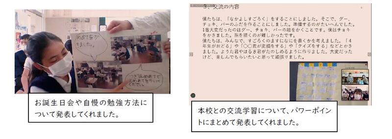 2月22日から3月9日の間の7日間、生活単元学習「交流学習をしよう」に取り組み、苓北町内の小学校3校(志岐小、富岡小、都呂々小)と交流及び共同学習を行いました。各小学校とオンラインでつなぎ、お互いの一年間の学習の様子を発表しあったり、みんなでテーマソングの「ツバメ」を歌ったりしました。交流校児童の声に反応して、画面に顔を近づけたり、視線や口元を動かしたりと交流相手の存在を感じながら、一緒に活動できました。