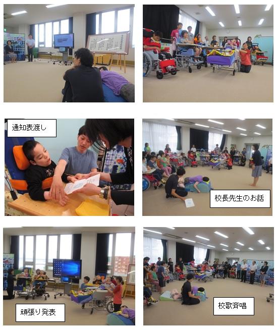 19日(金)の午後には通学生と院内の訪問教育の児童・生徒の終業式を行いました。校長先生より児童生徒一人一人が手渡しで通知表を受け取り、周りから拍手を受けて、児童生徒たちはとても嬉しそうでした。その後、小・中・高等部の代表が1学期頑張ったことを発表しました。最後に校歌をみんなで歌い、楽しい雰囲気で1学期を終えることができました。2学期に、元気なみんなに会えることを楽しみにしています。