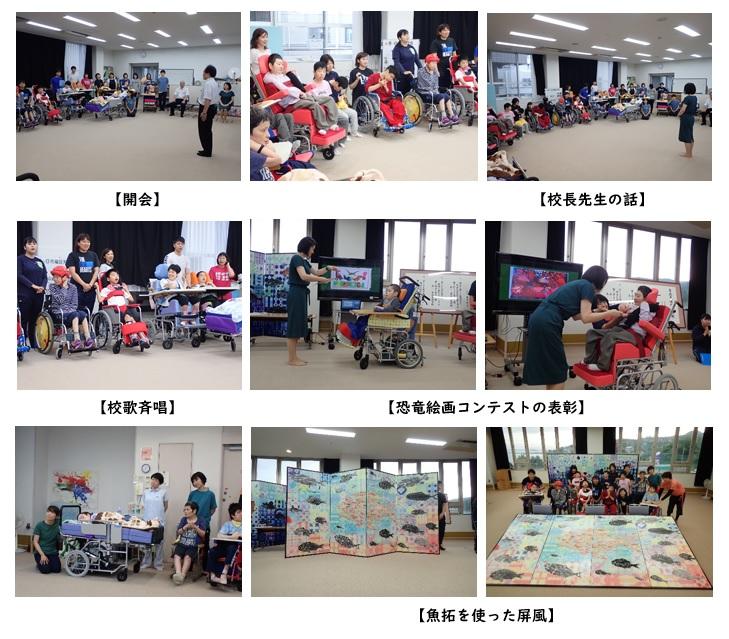式後は、御所浦白亜紀資料館開催の「第21回恐竜絵画コンテスト」で佳作に入賞し、その表彰がありました。代表の児童生徒は校長先生から賞状を受け取り嬉しそうにしていました。また、高等部の生徒たちが、1学期に取った魚拓で作った屏風を披露しました。