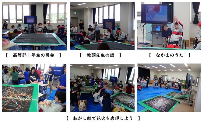 9月9日(月)に2学期最初の全校集会を行いました。今回は、高等部1年生が司会を務めました。元気の良い声で司会をしたり、スイッチを押して会を進めたりして、一生懸命に頑張りました。教頭先生の話では、○○の秋をテーマに話があり、児童生徒たちは楽しく話を聞いていました。「なかまのうた」を全員で歌った後のトピックスでは、学部間交流の取り組みとして、協力して作品作りを行いました。「転がし絵で花火を表現しよう」をテーマに小中高等部の児童生徒が、ゴッホ班、ピカソ班、ダリ班に分かれて活動しました。みんなで協力して広用紙の上で、絵の具を着けたテニスボールを転がしながら作品を作りました。みんな、楽しみながら活動に参加し、学部を越えて、より仲良くなることができました。