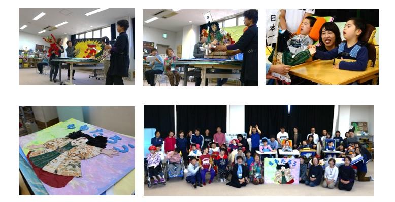 全校集会で、地域のボランティア団体のたんぽぽホールさんによるお話会を行いました。手遊び歌や、大型絵本の読み聞かせ、劇、特大紙芝居などを披露していただき、児童生徒は目をキラキラさせて見入っていました。特に「ももたろう」の特大紙芝居は、手作りの人形や迫力のある演技に「わーっ」と声を出したり、驚いた表情をしたりして大盛り上がりでした。