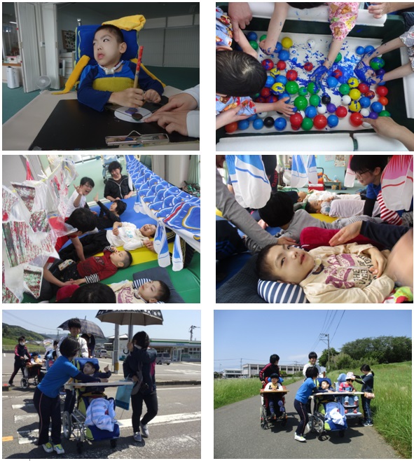 中学部と合同で、春の季節を感じる学習をしました。鯉のぼりを作る学習では、ボールを転がしたり、筆で塗ったりして色を付け、オリジナルの鯉のぼりを作りました。また、鯉のぼりを吊した下で、トランポリンを楽しむことができました。