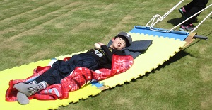 5月は友達や先生と一緒に身体を動かして楽しむ学習を行いました。トランポリンや毛布ブランコに乗って、身体を動かしたり、揺れを感じたりして、仲良くなることができました。また、天気のいい日に、はまゆうの丘で草スキーをしました。青い空と海に、芝生の緑色がとてもきれいな中、芝生の感触や風を感じて楽しむことができました。