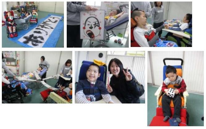 3学期最初の生活単元学習では、書き初めや福笑い、すごろくなど、古くから日本に伝わる活動を行いました。書き初めでは個人で目標を書いたり、大きな布に一つずつ文字を書いてみんなで「ありがとう」の大作を作ったりしました。福笑いではサイコロを振り、出た目の番号にある顔のパーツを集めていき、野菜でできた目や鼻などそれぞれ違った顔が出来上がりました。すごろくでは、ビリビリ相撲やおみくじ、友達と握手など、それぞれのマスに書いてあるお題をクリアしながら駒を進めていき、友達や教師と関わりながら楽しい時間を過ごしました。
