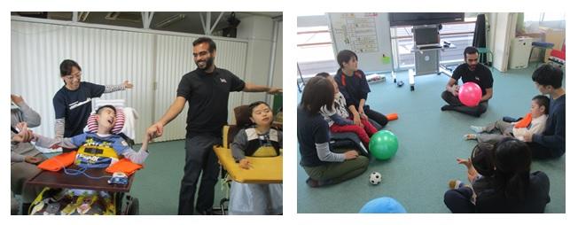 11月15日(金)の午後はALTのカイル先生との授業でした。お互いに自己紹介した後に、フルーツバスケットとボール遊びをしました。フルーツバスケットは、「5月生まれの人?」、「散歩が好きな人?」などが書かれたカードを引き、当てはまる人が手を挙げるというルールで行いました。そして、カイル先生に「5月」や「散歩」などの単語を英語で教えてもらいました。ボール遊びでは、いろいろな大きさや色のボールを比べながら、「big」「small」「green」「pink」などの英語を教えてもらったり、キャッチボールをしたりしました。英語に触れながら、カイル先生との活動を楽しむことができました。