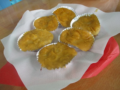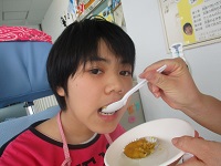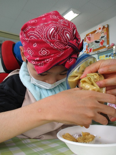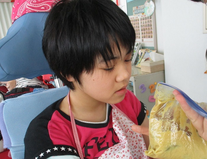 次は、サツマイモとプリンでスイートポテトを作りました。混ぜやすいようにチャック付きのビニール袋に材料を入れて、手で混ぜました。オーブンで焼くと教室中にいい香りが漂いました。2人とも大きな口を開けて、おいしそうに食べていました。やはり「食欲の秋」が一番だったようです。