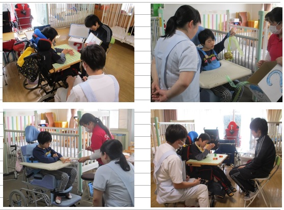 中学部の生徒2人は、日頃学校で行っている活動を生活の場であるはまゆう療育園の居室で行いました。はまゆう療育園の職員の方の前で、少し緊張していた様子でした。慣れてくると、いつも以上に張り切っていました。