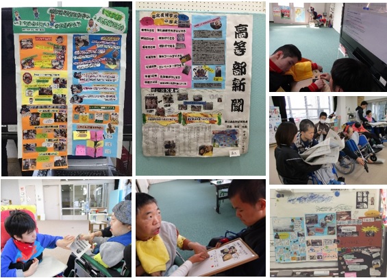 1/23(火)~2/2(金)にかけて、総合的な学習の時間で新聞作りに取り組みました。交流校である天草拓心高校マリン校舎の生徒に本校の様子を知ってもらうために、「苓北町の名所」「苓北支援学校の歴史」「学習紹介」の3グループに別れて新聞を作りました。それぞれのグループに分かれて、インターネットで苓北町に関する情報を調べたり、先生や友達にアンケートをとったり、校内で取材活動をしたりして、グループごとに特色のある新聞ができました。最終日の2/2(金)は、小・中学部の児童生徒や先生方を招いて、発表会を行いました。新聞は、交流校に展示していただき、感想等を書いてもらうなど、やりとりを通して、交流を深めていきたいと思います。