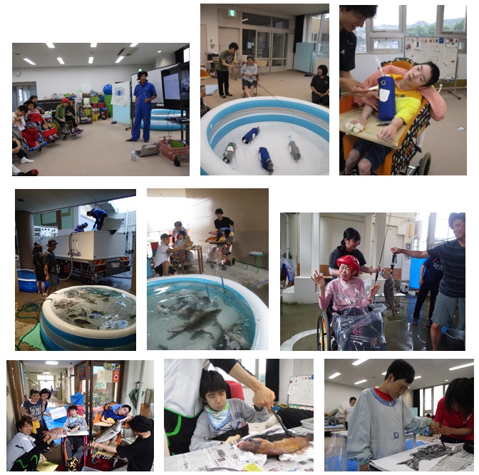 7月3日(水)は、早朝より小林水産様にたくさんの大小の魚や生き物を持ってきていただき、ビニールプールに泳がせました。生徒たちは、生きの良い魚たちを見ながら海の生き物について知り興味関心を深めることができました。また、生徒たちは釣り竿で魚を釣るときの引きの力強さに驚いている様子でした。そして、慣れた手つきで魚たちに墨を塗って魚拓をとることができました。天草拓心高校のマリン校舎の生徒のみなさんとの交流の予定でしたが、残念ながら大雨のため実施できませんでした。2学期以降交流を深めていきたいと思います。