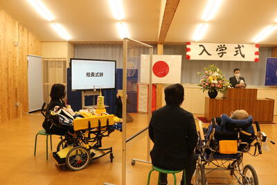 令和4年4月11日(月)に中学部(1人)と高等部(5人)の入学式を行いました。コロナ感染予防のため新入生、保護者、関係職員のみの開催と規模を縮小しましたが、高等部3年生からの歓迎のビデオメッセージを視聴し、新入生はこれからの学校生活に向けて期待をふくらませていました。