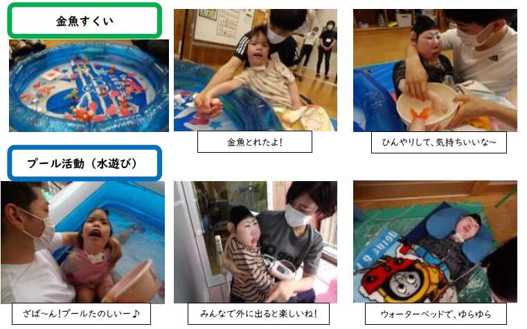 7月1日(月)から12日(金)の8日間、生活単元学習「夏を楽しもう」の学習に取り組みました。プール活動(水遊び)や、夏を感じる遊び(水鉄砲の的当てゲームや、金魚すくい)に取り組み、毎日水を使った活動を楽しみました。水の冷たさや、波のゆらゆら感を感じ、夏を存分に味わうことができました。