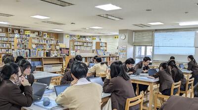 本校では、家庭系列があるため、ソーイングや繊維、染物についての本がたくさんあります。本やインターネットを使用して、どんな材料(素材)でどんな工夫がされているバッグにするか独自のデザインをタブレットに記入していきました。