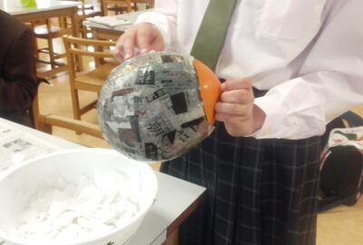 この気球は和紙でできた気球です。作り方は風船を膨らませて、その上にちぎった新聞紙・和紙をデンプン糊で何回も重ねて貼り付けます。完全に乾いたら風船の空気を抜きます。その上に、色を塗って完成です!何回も重ねて貼るのに苦労しました。また、思ったより完全に乾くのに時間がかかりました。