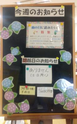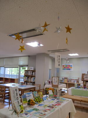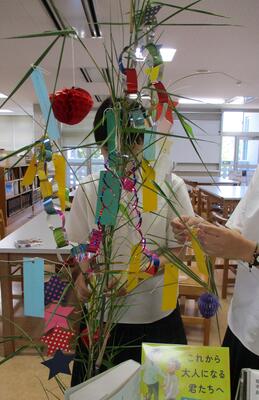 7月1日~7月7日までは七夕飾りもあります。この笹は、翔陽高校内の「翔陽の森」に生えている笹です。(園芸・造園の先生に許可を得て切りました)暑さのためか少し小さめですが、図書館の夏の風物詩となっています。