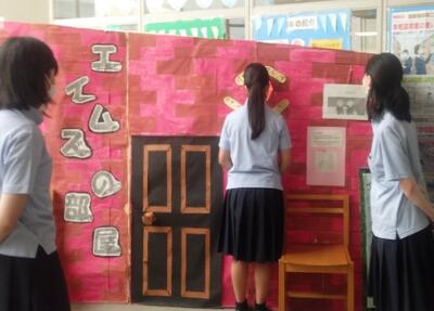 7/13(水)本校にて城東地区図書委員研修会が行われました。担当校だったため、本校図書委員で、受付から司会進行、企画の説明まで行いました。みんな緊張していましたが、最後には他校生徒と仲良くなり、笑顔で終わることができました。昨年度文化祭に作成した「エイムズの部屋」(錯覚を起こす歪んだ部屋)も好評でした!