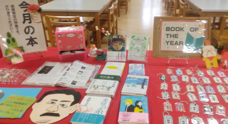 図書委員が作ったお守り、おみくじなども並んで、華やかな雰囲気の1月の図書館です。