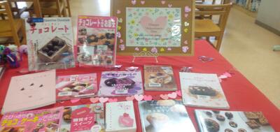 甘い匂いが漂ってきそうな2月の図書館。チョコレートづくりの本を1年次図書委員が集めてくれました。