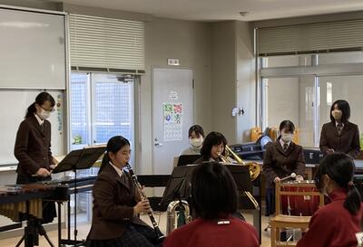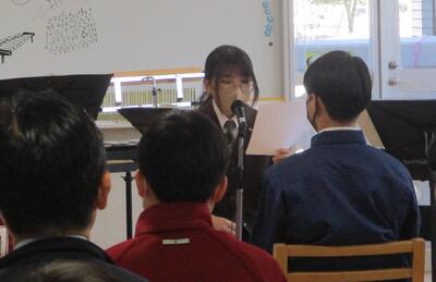 後半は、吹奏楽部が「となりのトトロ」「offical髭男メドレー」を演奏しました。吹奏楽部員3人+助っ人の2人+先生の計6人と少ない人数ながら、頑張って演奏してくれました。
