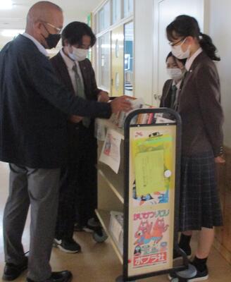 また、春の読書週間企画として、1冊借りると1冊もらえる、雑誌のバックナンバー・ポスター配布を行っています♪1年次生も早速、雑誌を選んでいました!