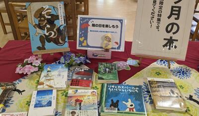今月の本は「夏を感じる本」です。3-3図書委員が「花火」「ひまわり」など夏を感じさせる書名の本や、表紙にスイカや入道雲など夏らしいイラストがついている本を選んで展示してくれています。暑いですが、夏を楽しみましょう!