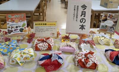 図書館では、秋のピクニック気分が味わえる『本のお弁当箱』を用意しています。