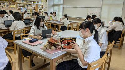 本校では、家庭系列があるため、ソーイングや繊維、染物についての本がたくさんあります。本やインターネットを使用して、どんな材料(素材)でどんな工夫がされているバッグにするか独自のデザインをタブレットに記入していきました。