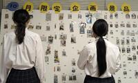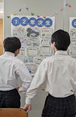 景品の写真は図書館近くのスペースに展示。生徒も職員も立ち止まって見ています。