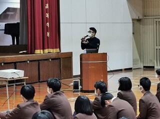 先生ご自身のYouTubeチャンネルやテレビ番組の動画、クイズを交えながら、音声コミュニケーションの大切さについて、また、本校のスローガンである「自ら気づき、考え、行動する」にちなんで、働くとはどういうことかなどについてお話ししていただき、あっという間の1時間でした。