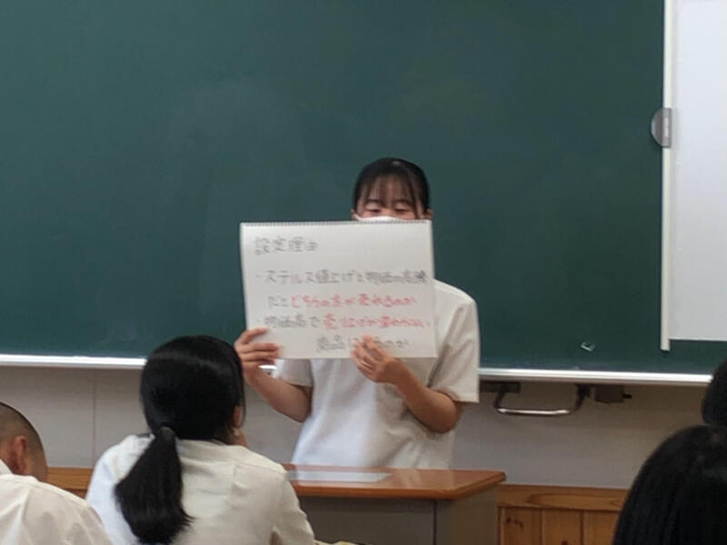 当日は、(株)丸菱ホールディングス広報室の徳久史佳様の司会の下、様々な意見が交わされました。その中でも(株)丸菱ファクトリー社長執行役員の吉田寿和様からお話しいただいた業界の状況や(株)丸菱ホールディングス様の技術力の現状などの内容は、とても興味深い内容ばかりで、生徒たちだけでなく、引率の職員も集中してお話をうかがっていました。