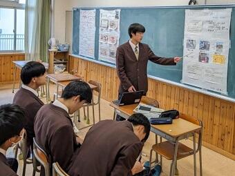本校は、「令和4年度(2022年度)外国語教育における小中高連携モデル校」として県の指定事業を受け、11月1日(火)に本校スーパーティーチャーの波佐間裕指導教諭による「英語コミュニケーションⅠ」の公開授業を実施しました。公開授業には大津町内の小学校、中学校、高等学校、県教育委員会及び大津町教育委員会から多くの先生方に出席していただきました。