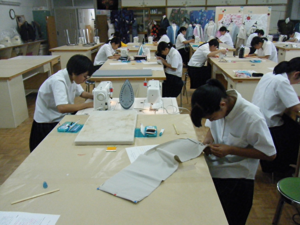 「ファッション造形」の時間を使って被服検定1級に取り組みました。授業では、事前作業、本作業は練習を重ね、事後作業を行いました。実技試験は、12月上旬の土日を使って、本作業(肩縫い・えりぐり・前端縫い・わき縫い・すそのしまつ・右袖付け)を、検定時間4時間で行いました。2年間の授業の集大成として、裏付き洋服の構成と製作に関する専門的な知識と技術を身に付けました。