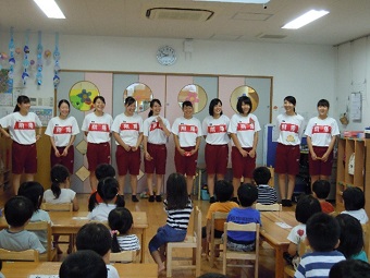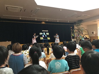 楽しんでもらえるよう工夫を凝らした手作りおもちゃは、園児たちに大好評でした。七夕が近いということで七夕会にも参加させていただき、ブラックシアターを一緒に楽しみました。中には将来保育の道に進もうと考えている生徒もおり、今回の経験が夢を叶える第一歩となるようこれからも頑張っていきたいと思います!
