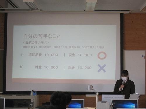 3月18日、3月19日商業系列2年次情報処理の授業で発表会を行いました。個々人が2年次で学んだ学習内容を振りかえり、自己の成長や課題は何かを考え、次年度に向けた目標を立てた内容をPowerPointで発表しました。