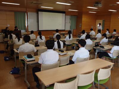 9月19日(木)午後 商業系列2年次を対象に、大津町役場産業振興部商業観光課 古嶋 彩花 様、宇野 真 様を講師に迎え、「大津町の祭りと観光」をテーマに出前講座を実施しました。大津町特産の特産品(からいも)や大津町の歴史など、大津町に対する興味・関心を高め、地域を盛り上げていく方法についてお話いただきました。生徒達は講演の後、大津町の印象や調査してみたいことについて話し合い、大津町の発展に高校生として貢献できることをまとめ、発表しました。これを参考に3年次には、各自がテーマを設定し探究活動を進めます。