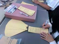 写真ではわかりにくいかと思いますが、売上伝票は、お客様から注文を受けた内容を生徒が記入する書式になっています。商品名と数量等を記入する用紙で、レストランの注文票と似た書式です。文化祭当日はこれを使って生徒たちがお客様からパンの注文をうかがい、そのパンを準備してお渡しする形になります。