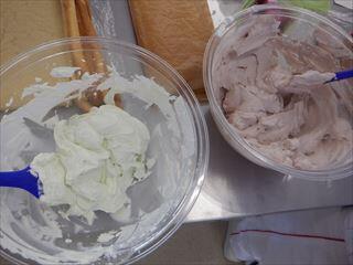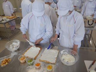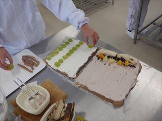 農業系列食品製造3年次生が、食品製造βの授業で、前回(ロールケーキを巻きます~生地焼成編~)に引き続き、デコレーションを行いました。今回は、生徒の要望で、ココアと抹茶を用意し、各々好きな味のクリームに仕上げました。