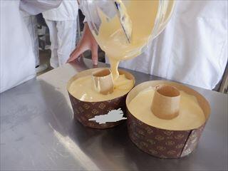 今回は、生地焼成まで。ふんわり生地に仕上げるために、卵をしっかり泡立てます。