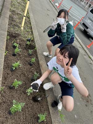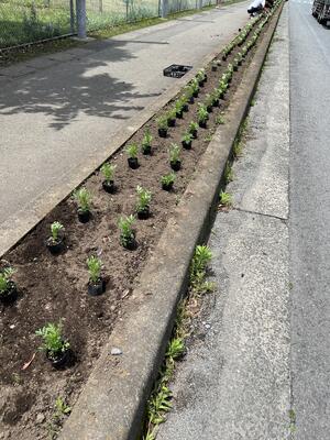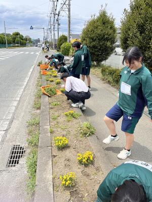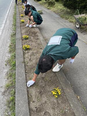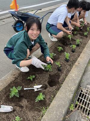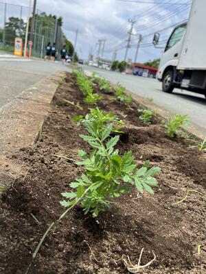 翔陽高校前の道の両脇にある前花壇にマリーゴールドを定植しました。