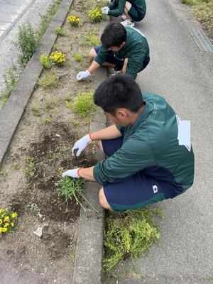 グリーンデザインの実習でマリーゴールドの鉢上げと前花壇の除草に取り組んでいます!