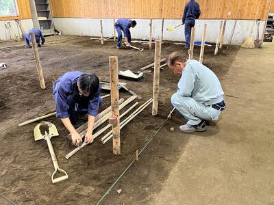 竹垣に使用する柱を2本、指定された場所に立て込みます!