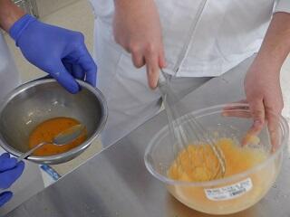 卵の泡立つ性質を利用したお菓子であるため、しっかり泡立てることがポイントです。今回は、卵を黄身と卵白に分けないといけません。