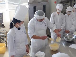 シュー、カスタードクリームの製造も初めてだった生徒たちは、講師の話をしっかりと聞きながら取り組んでいまし た。しかし、中には、何度やってもうまくいかない生徒も・・・。