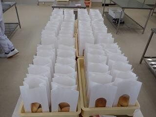 限られた時間内での実習のため、①製造工程を理解してもらうこと、②分割・丸めの工程を経験してもらうこと、を目的として行いました。この経験をいかして、大量生産につなげていきましょう。持ち帰りの包装袋にスタンプを押して、オリジナル感も出してみました。みなさん、自作のパンはいかがですか?試食後の感想を聞かせてください。