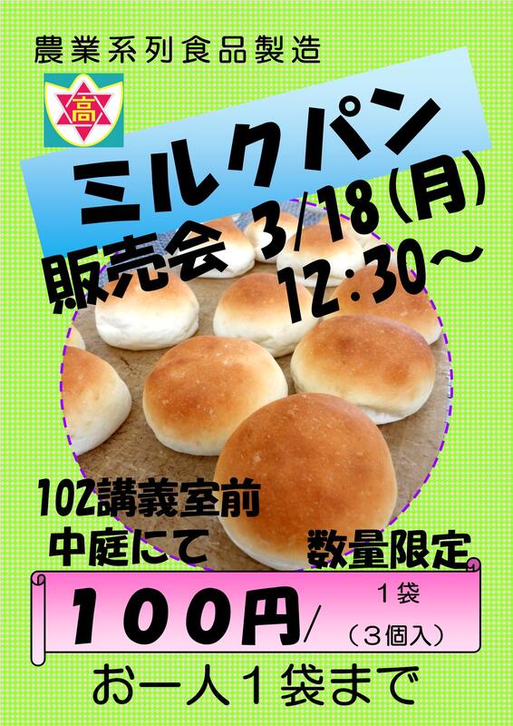 3月10日(月)、農業系列食品製造2年次生の授業で、ミルクパンの製造・販売を行いました!