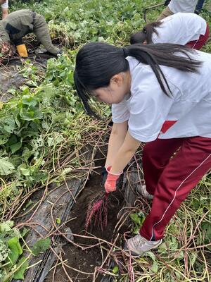 1年次生の選択科目「農業と環境」で3月に定植したジャガイモが収穫の時期を迎えました。ゴロゴロ出てくるジャガイモを楽しそうに掘る生徒たち