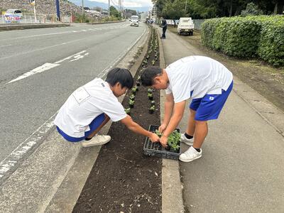 翔陽高校前の道の両脇にある前花壇にマリーゴールドを定植しました。
