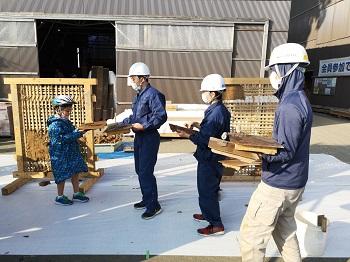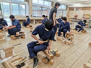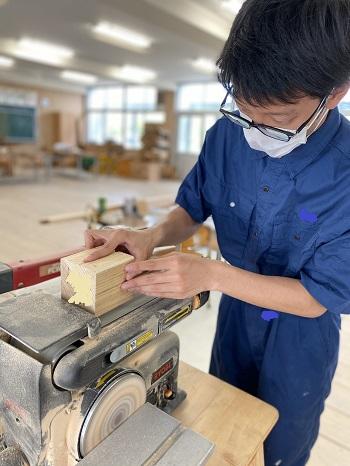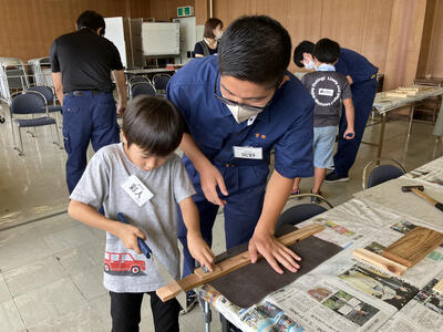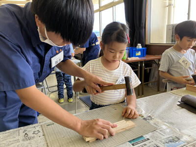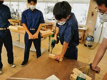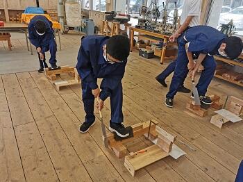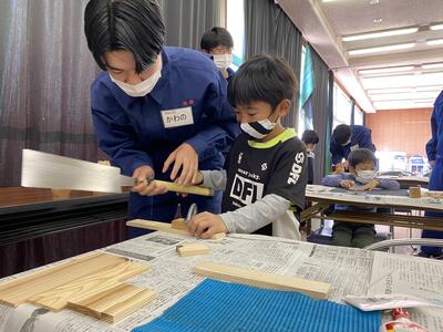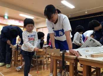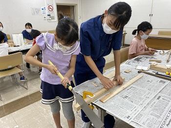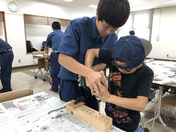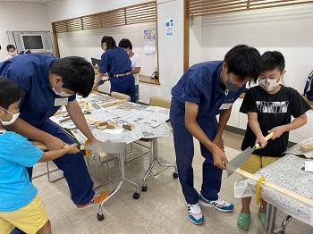 建築を学ぶ3年次生徒が講師となって、子ども達に木を使ったものづくり指導を行いました。