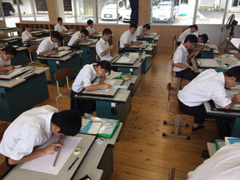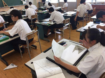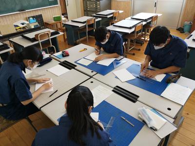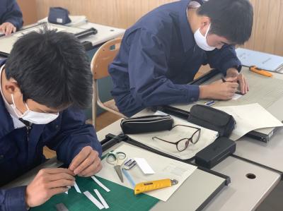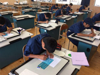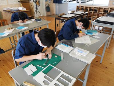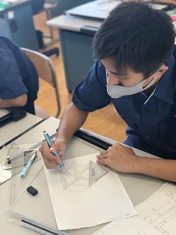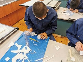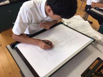 始めは1年次の工業技術基礎の建築製図です。課題は平屋建て木造住宅のトレースです。基準線が書いてある図面に図形の切り欠きが施されたテンプレートという定規を使い作図を行います。生徒らは初めての作業に戸惑いながらも集中して取り組んでいる様子です。